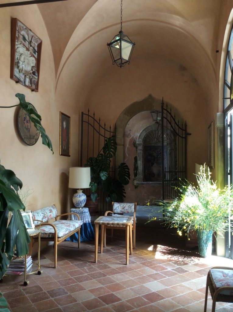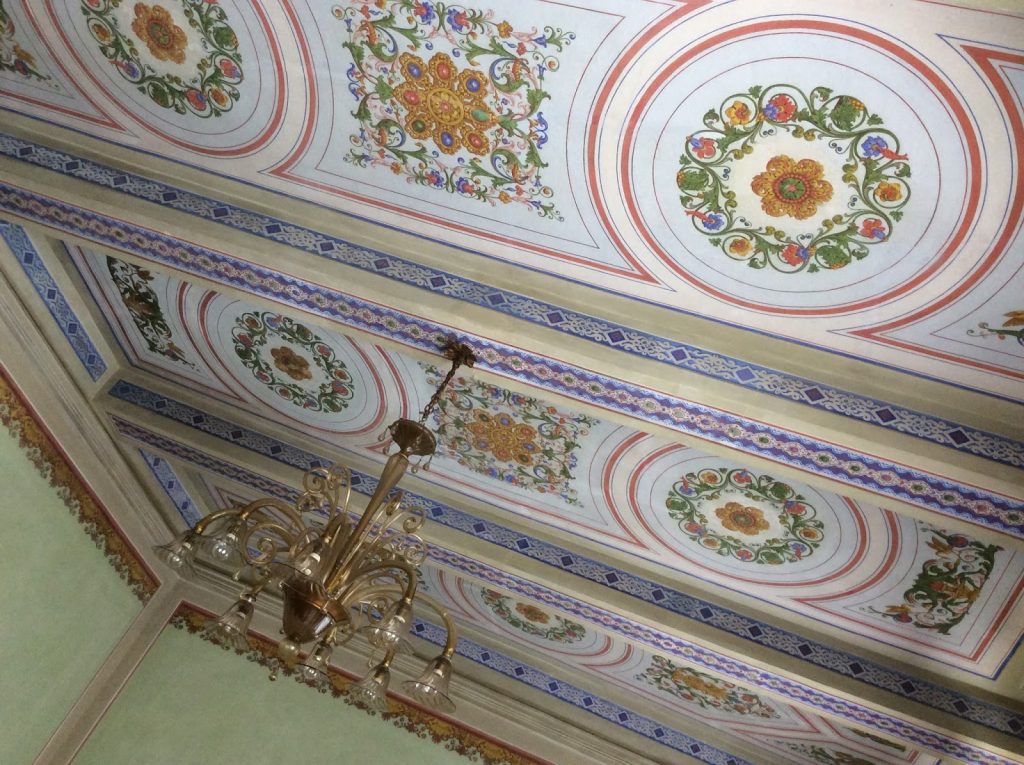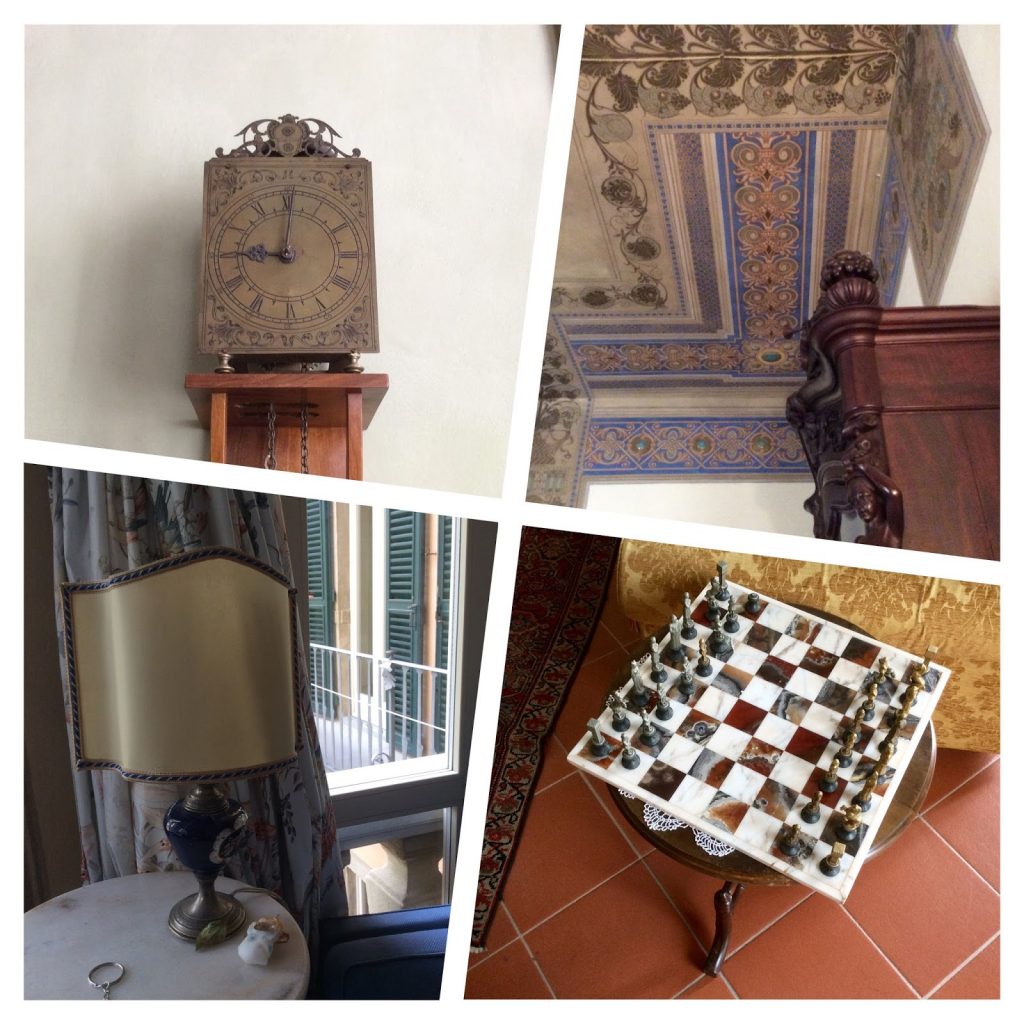 Una volta saliti ai piani superiori, ammiriamo gli arredi,  i soffitti a cassettoni opera di Pio Chini (zio di Galileo Chini), gli splendidi lampadari, i preziosi dettagli delle architetture, fino a giungere ad un’ampio salone dove si integrano due preziosi contributi artistici: un affresco attribuito a Silvestro Lega, raggigurante una drammatica vicenda che vide protagonista la famiglia Torriani e gli splendidi decori firmati Galileo Chini, pittore, decoratore, grafico e ceramista, protagonista del Liberty italiano.